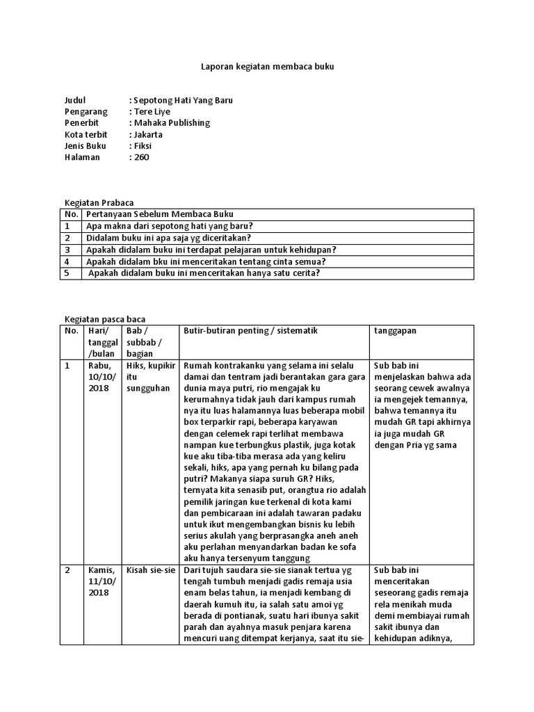 Laporan harian kegiatan membaca judul buku : Bindo laporan kegiatan membaca buku. Oct 16, 2017 · laporan kegiatan membaca / literasi. Cetakan iii juli 2007 tebal halaman. Laporan kegiatan membaca novel pulang karya tere liye halo semuanyaaa. Assalamualaikum , alhamdulillah pada kesempatan kali ini saya akan berbagi sedikit artikel terkait apa yang kalian cari, semoga informasi dan refrensi yang saya berikan dapat berguna dan membantu anda, kritik dan saran sangat saya harapkan demi perkembangan yang lebih baik dikemudian hari. Contoh laporan harian kegiatan membaca novel berbagai contoh. Bab informasi penting 1 1 2 3 magetan, 14 februari 2018 mengetahui orang tua/ wali guru bahasa indonesia. Contoh laporan harian kegiatan membaca buku fiksi singkat seputar laporan laporan literasi buku nonfiksi laporan harian kegiatan membaca buku non fiksi Laporan kegiatan membaca buku non fiksi singkat. Kali ini indri mau share tugas indri nih laporan kegiatan membaca novel pulang dari tere liye. Jakarta, 19 april 2018 smk negeri 9 jakarta setiap minggunya selalu mengadakan kegiatan literasi membaca novel, tepatnya kegiatan ini dilaksanakan sebelum kegiatan belajar mengajar. Admin blog kumpulan contoh laporan 2019 juga mengumpulkan gambar gambar lainnya terkait contoh laporan harian kegiatan membaca buku fiksi singkat dibawah ini.