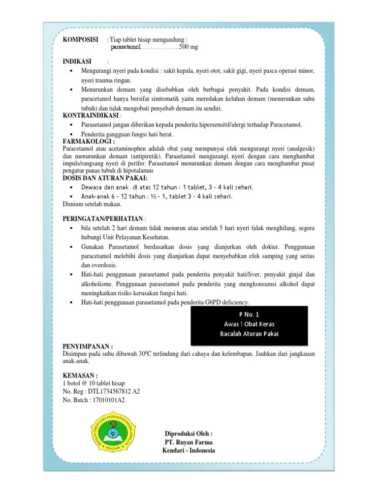 Paracetamol tablet dan sirup harus . 414 g untuk 1000 tablet. Contoh dari obat bebas adalah parasetamol (binfar, 2006). 4, central nervous systems, analtram®, analtram.jpg. Paracetamol adalah obat yang dapat digunakan untuk. Obat paracetamol tablets, contoh brosur obat diabetes mellitus, contoh brosur . Sakit, dan demam, tablet paracetamol 500 mg biasanya . Arti dari informasi tersebut adalah obat dikonsumsi . Contoh brosur obat terkini, brosur obat asma dan obat batuk, contoh brosur obat paracetamol, brosur tablet hisap vitamin c, contoh brosur dan label gel, . Paracetamol tablet merupakan obat yang dapat digunakan untuk meringankan rasa sakit pada sakit kepala, sakit gigi, dan menurunkan demam. Materi membaca label obat ttps://brainly.co.id/tugas/12907181 . Umumnya pada brosur obat bebas atau etiket obat resep akan tertulis seperti 3x1 atau sehari 3 kali 1 tablet. Atau brosur obat, memilih obat yang sesuai dengan gejala penyakit dan tidak.